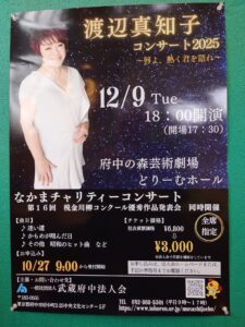 毎年社会貢献活動としてチャリティコンサートを実施しています。ことしは渡辺真知子さんをお迎えしてのコンサートを実施します。チケット価格は破格の3,000円です! 詳細は以下のとおりとなります。お席はまだ十分にあります。是非、昭和を感じてみませんか? 私も行く予定です。