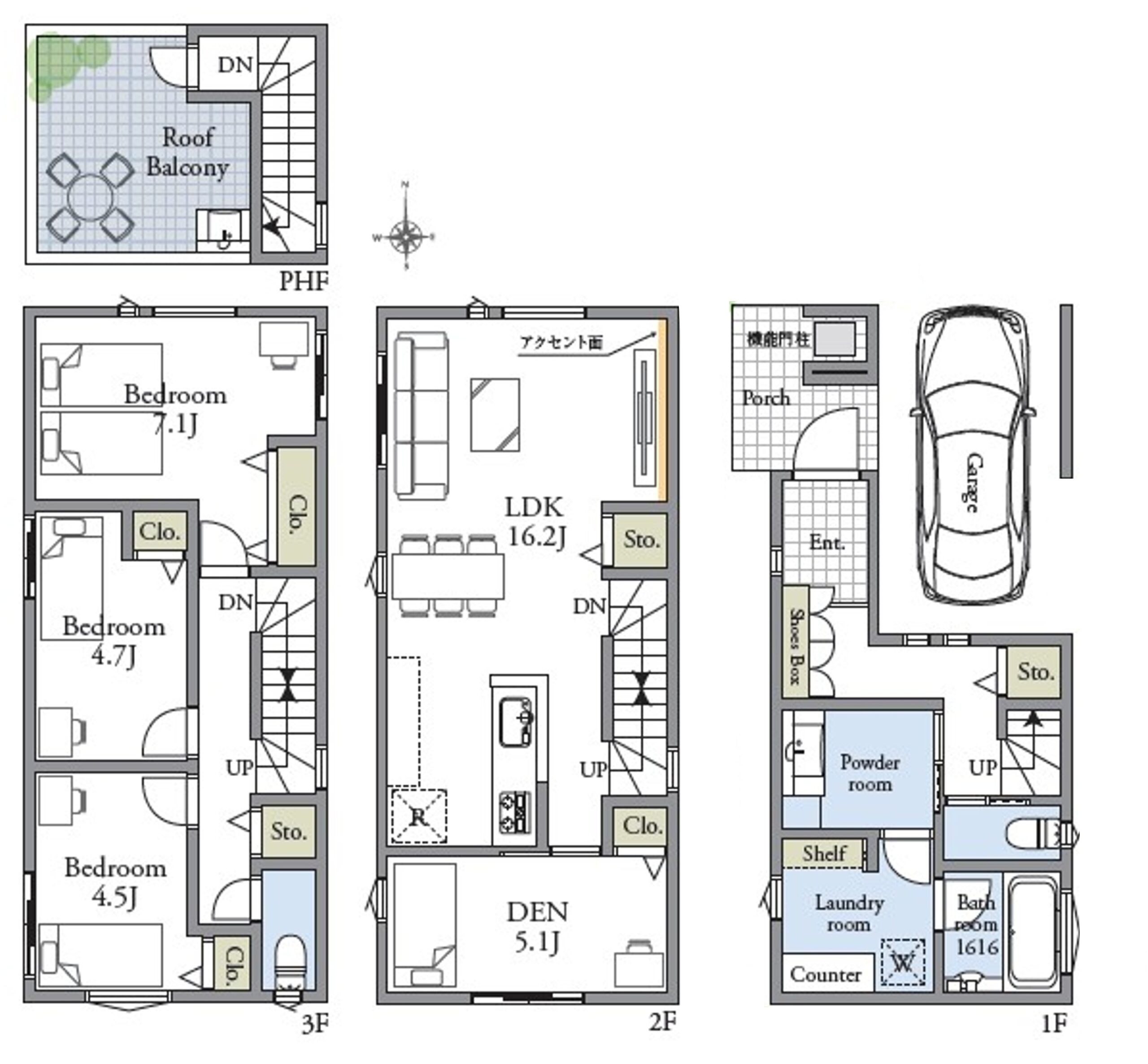 Court.A:121.08平米(約36.62坪)1階39.12平米-2階39.12平米-3階39.12平米-ペントハウス面積3.72平米※車庫面積12.42平米含む