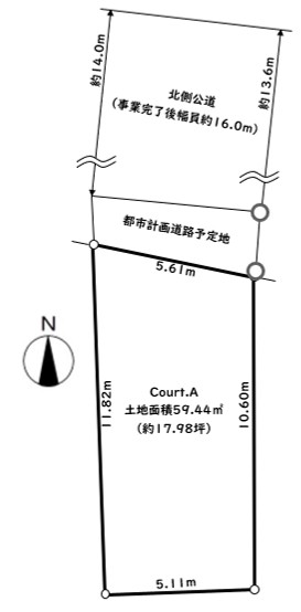 都市計画道路事業完了後、幅員16.0m公道にCourtAは約5.6mに接道。