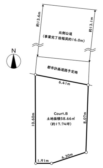都市計画道路事業完了後、幅員16.0m公道にCourt.Bは約6.4mに接道。