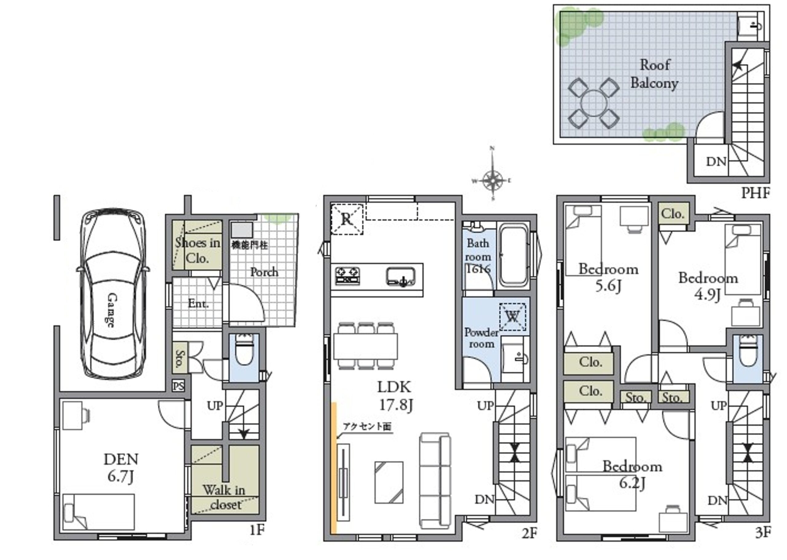 Court.B:121.71平米(約36.81坪)1階39.33平米-2階39.33平米-3階39.33平米-ペントハウス面積3.72平米※車庫面積13.24平米含む